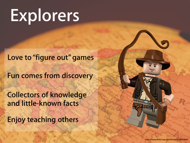 By contrast with Explorers, students who are Achievers love to gain levels, badges, and awards. In the game world, Achievers gain a sense of accomplishment by being the first to complete something, or by being one of the only ones to win a trophy or reward. They are often very motivated to "beat the game" and move on. In the classroom, Achievers are often most concerned with grades as a measure of their achievement. They want to know the quickest, fastest, or shortest way to the prize. They are often detail-oriented, and I can count on the Achievers in my classroom to help move the others along, simply for the thrill of succeeding.